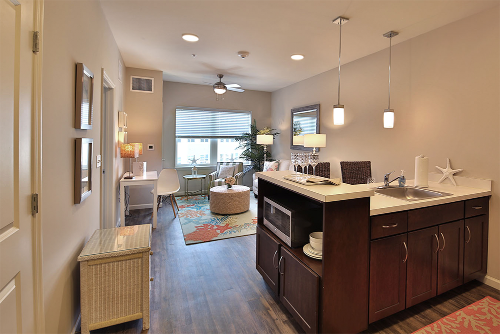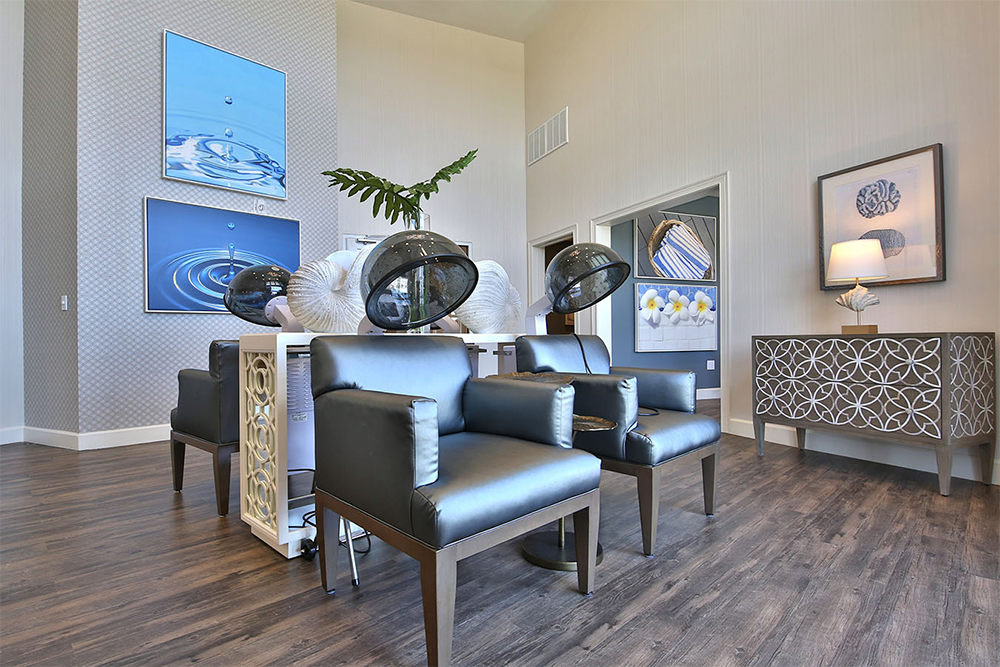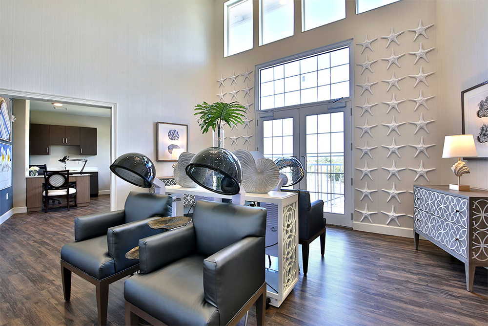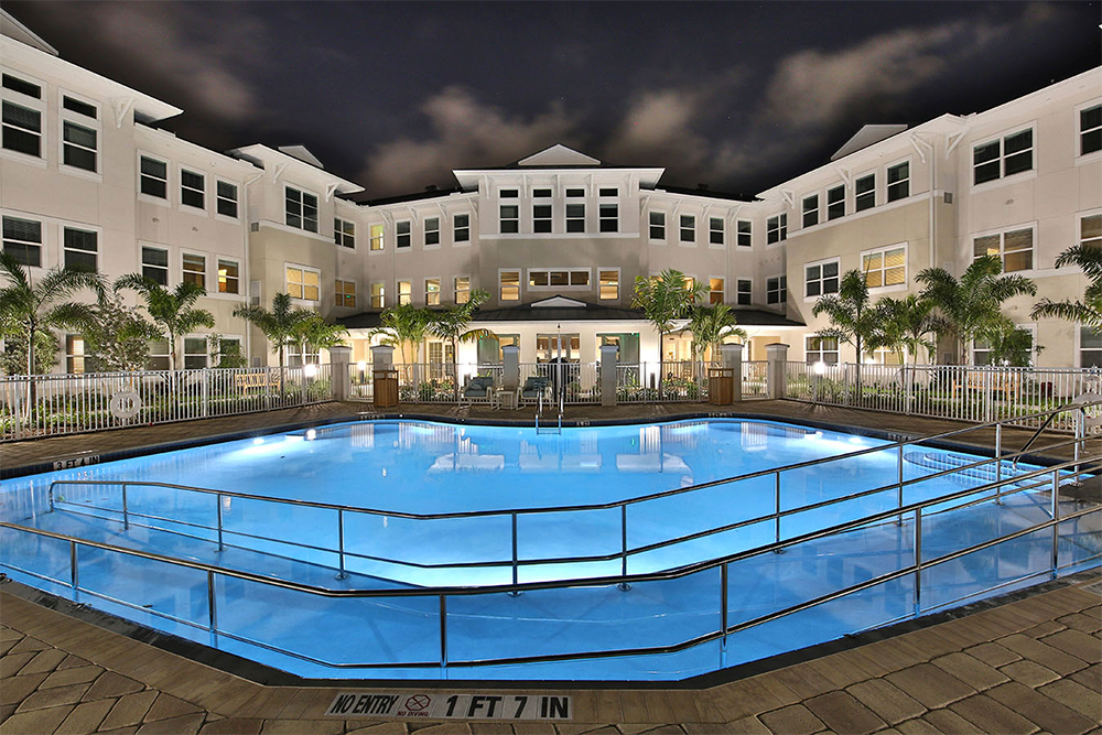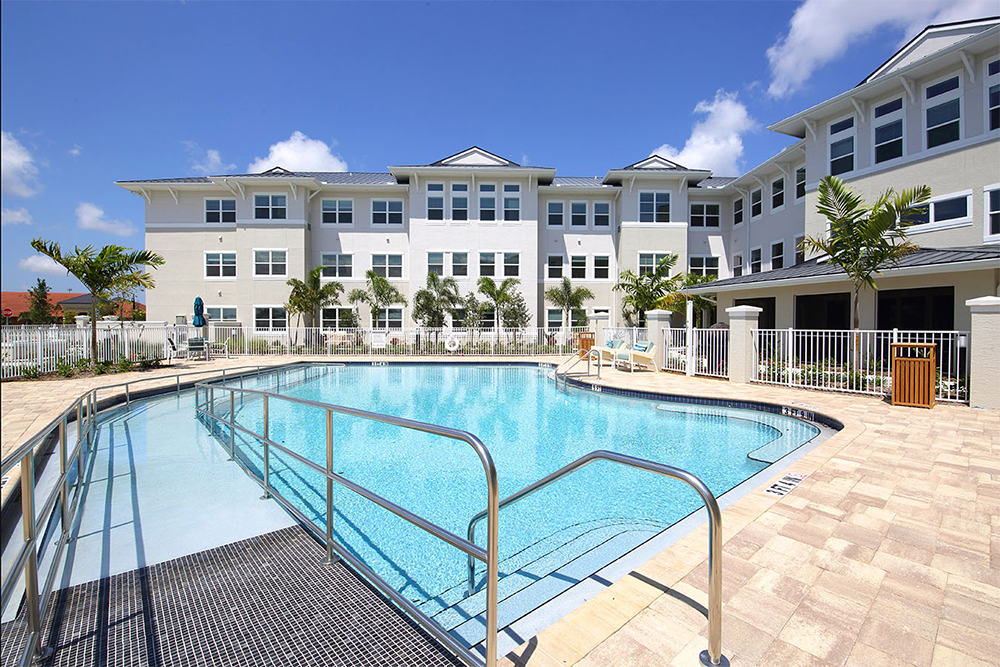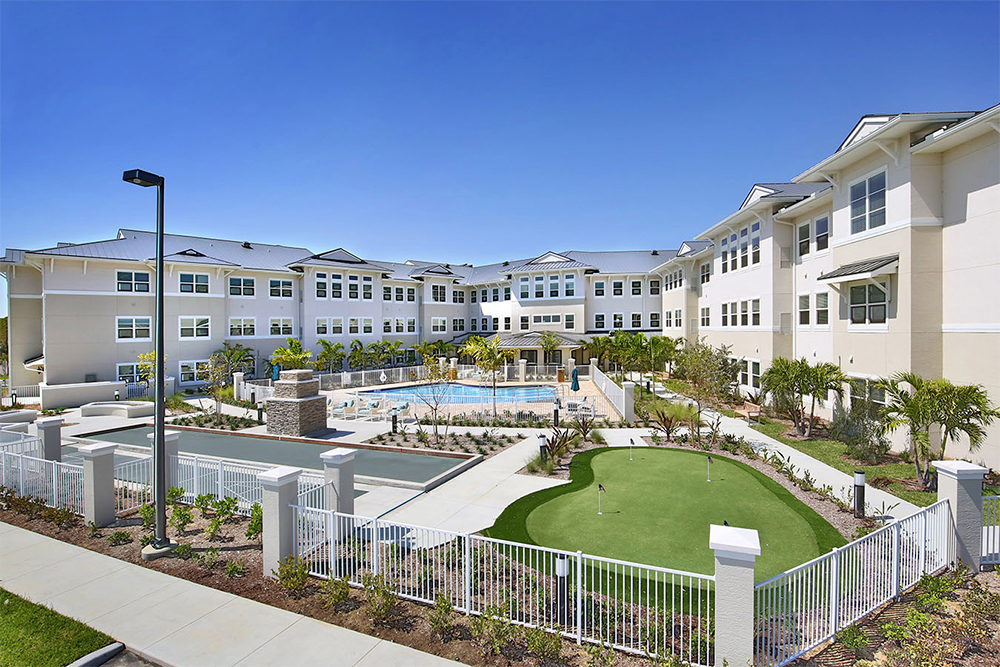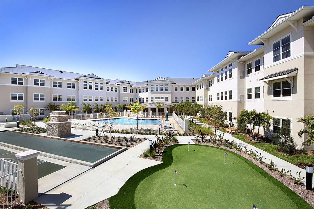 Residents can enjoy a full service restaurant, café, salon, and health club. Other onsite amenties include secured courtyards, garden areas, putting greens, a pool and bocce ball court.