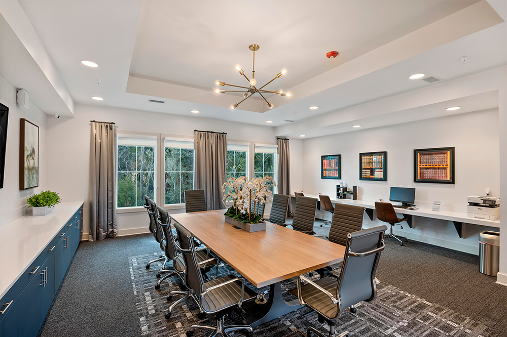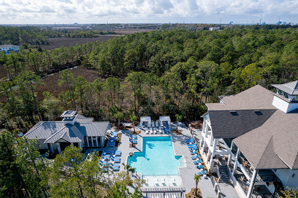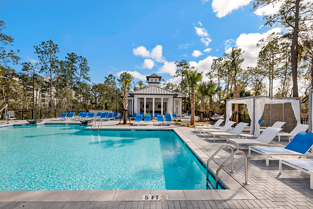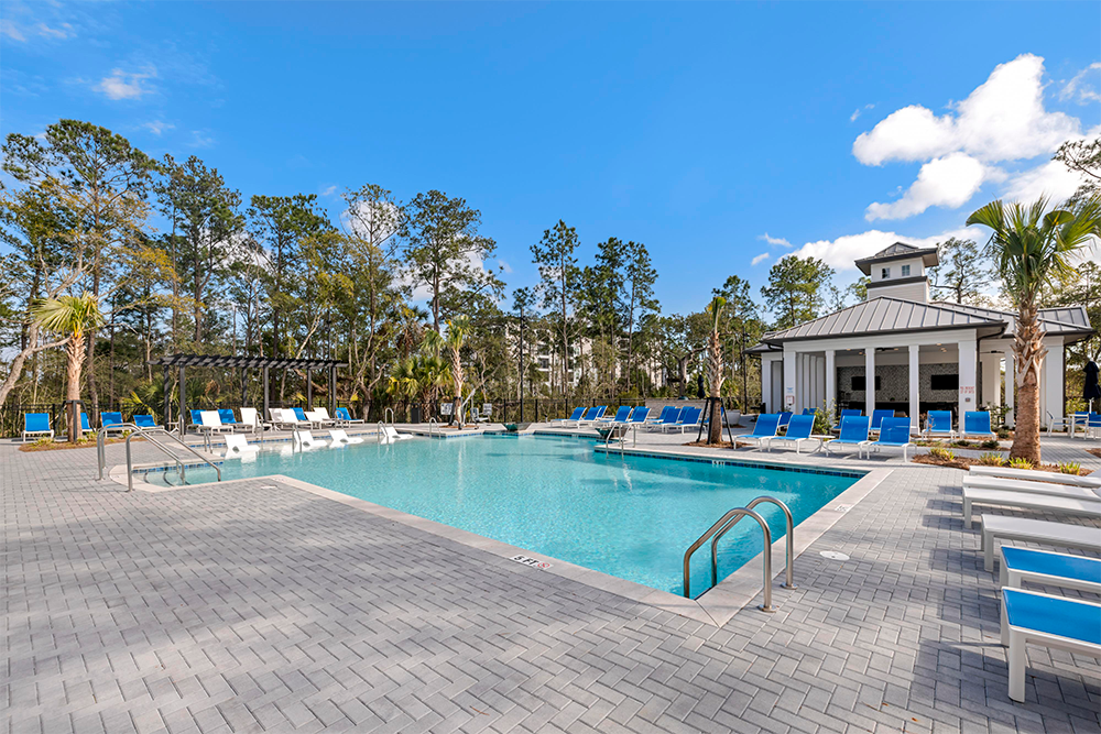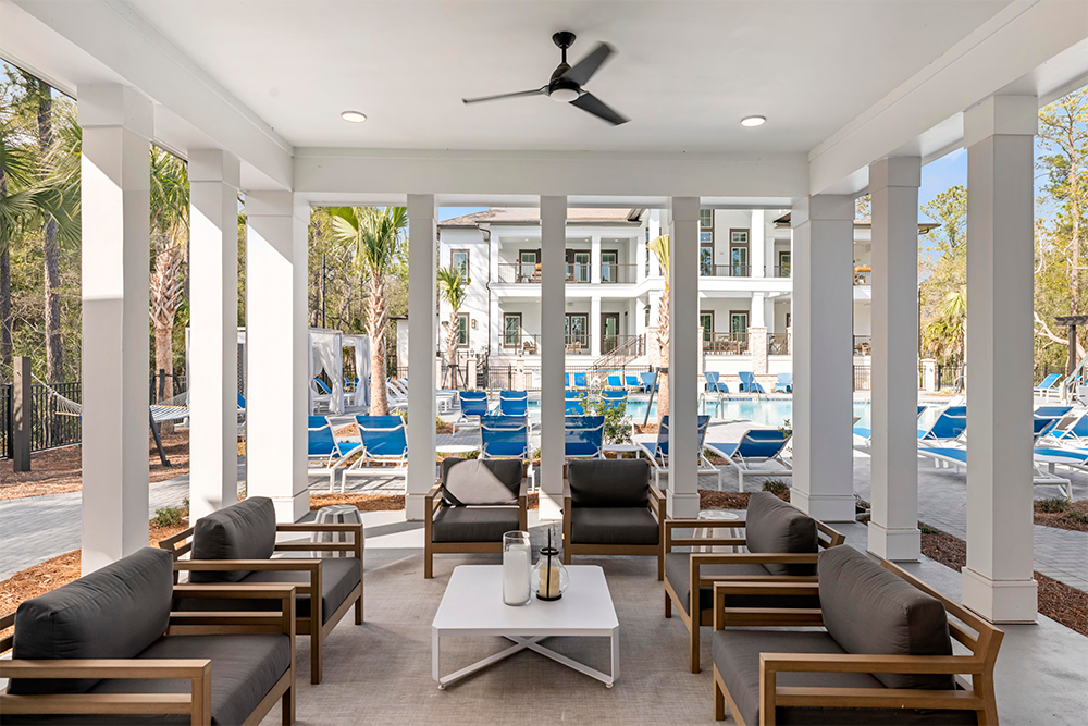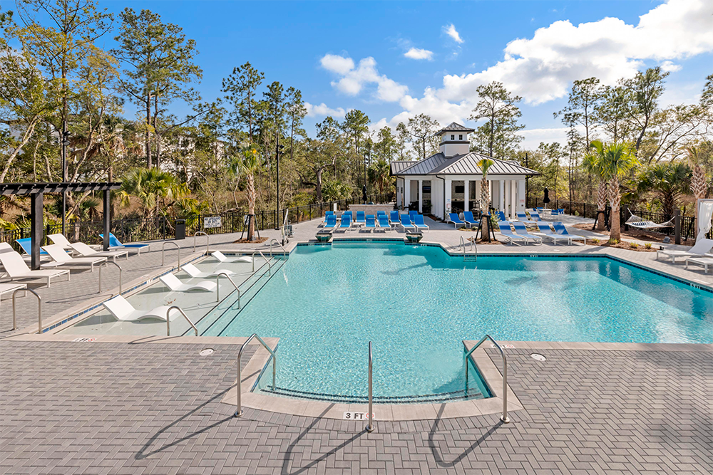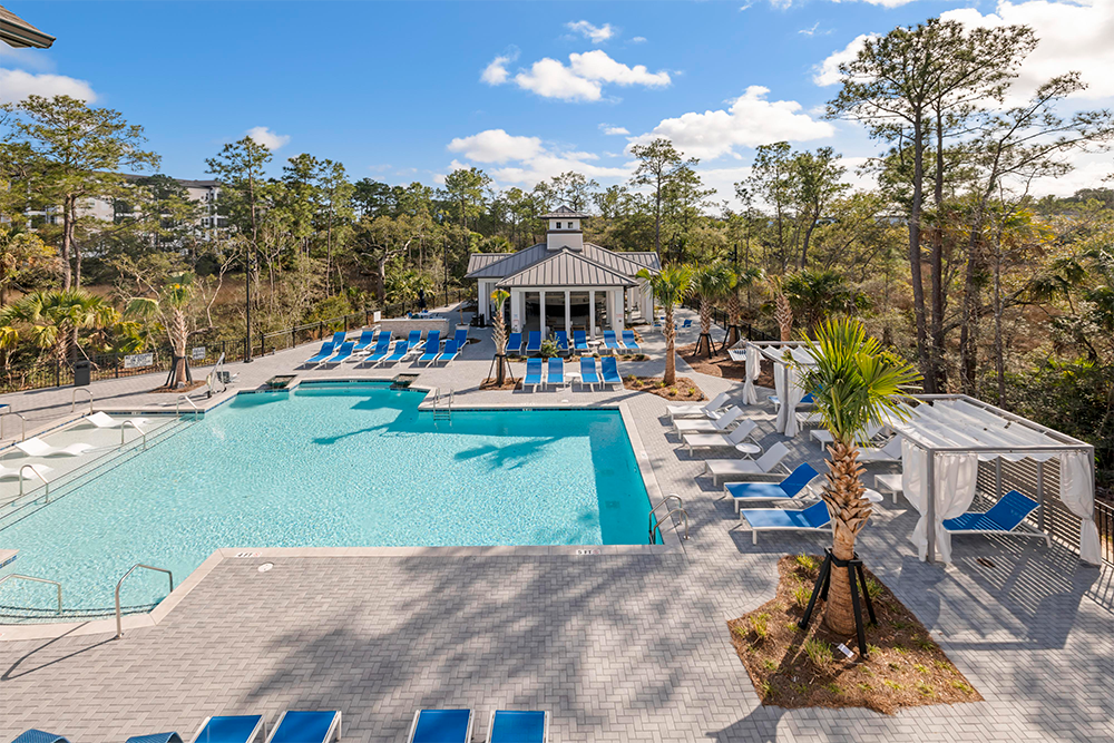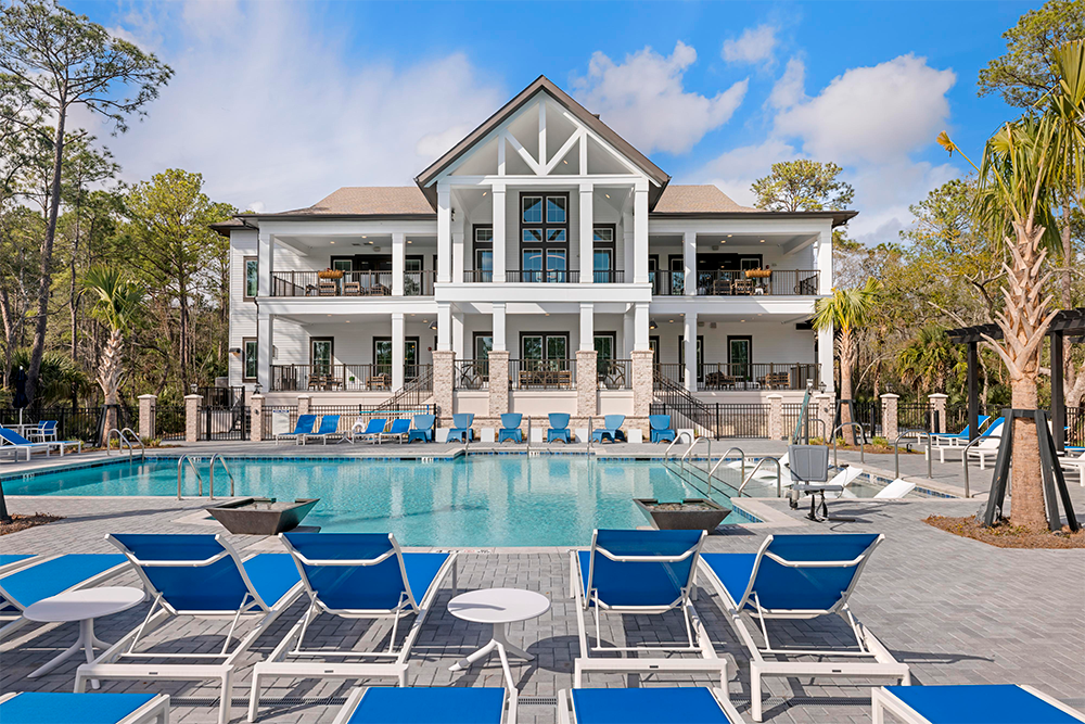 Resort style amenities are accented by a two-story clubhouse with wrap around Low County style balconies and open courtyards. The clubhouse offers a large pool with a covered summer kitchen and open fire pit area. The 16,000 square feet of amenities include clubrooms with entertainment lounges, a Cyber Café, gaming center, theater, fitness room, Yoga studio, and mail center.