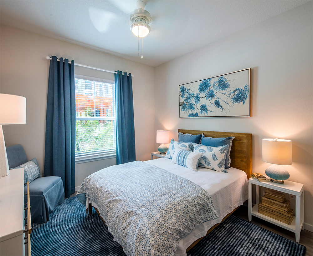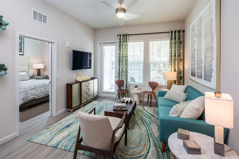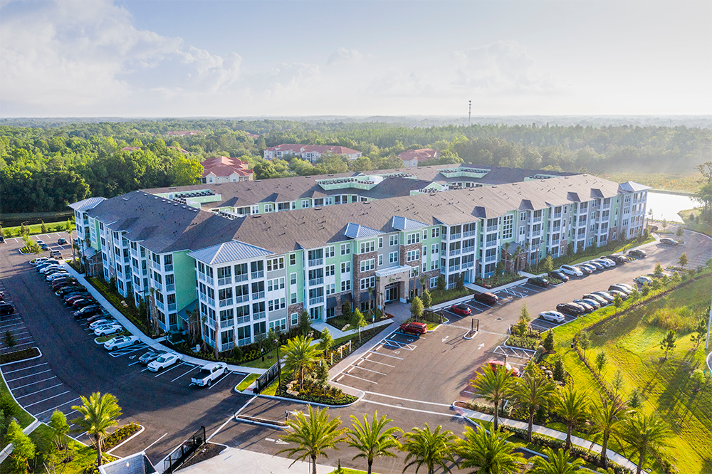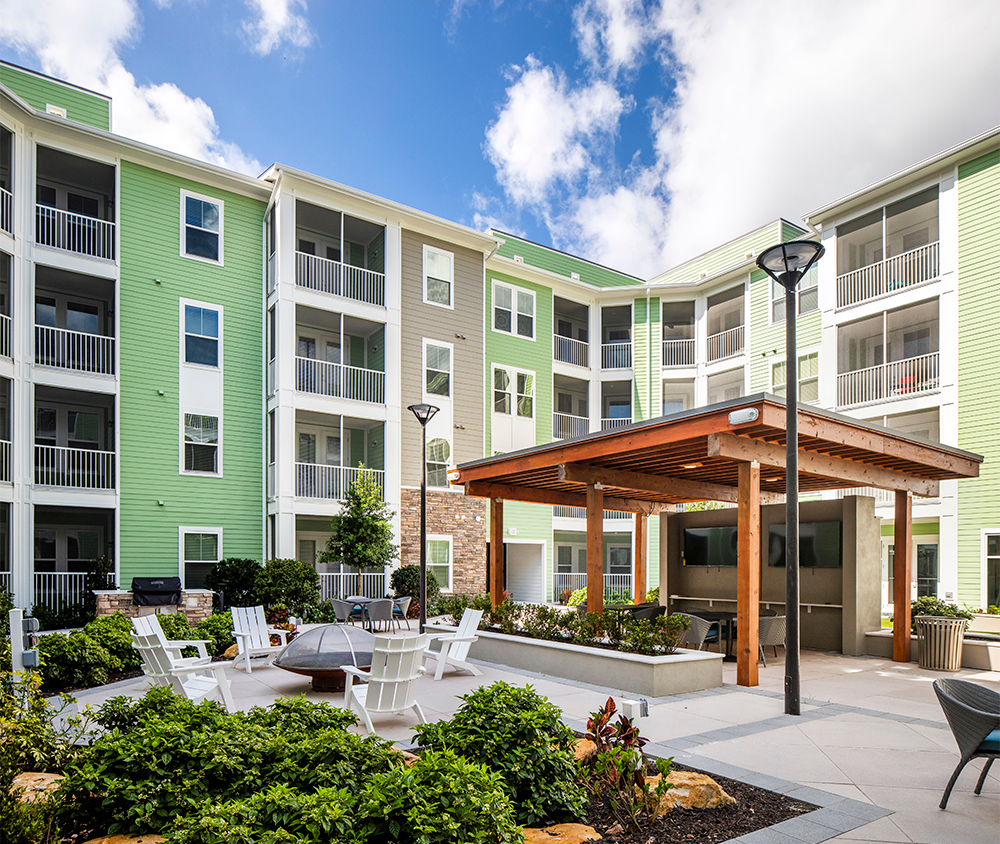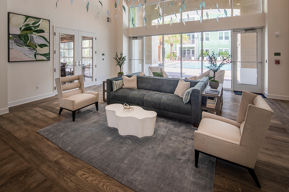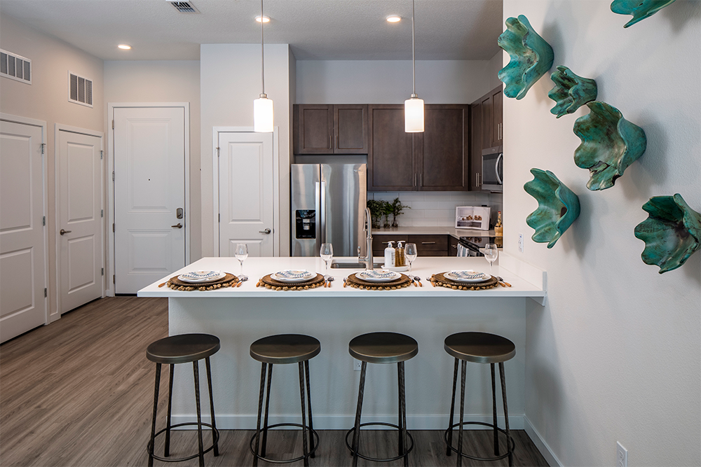 Units are built in a variety of one, two, and three-bedroom floorplans with screened-in patios. Other interior features include quartz countertops, shaker cabinets, and LVT flooring.