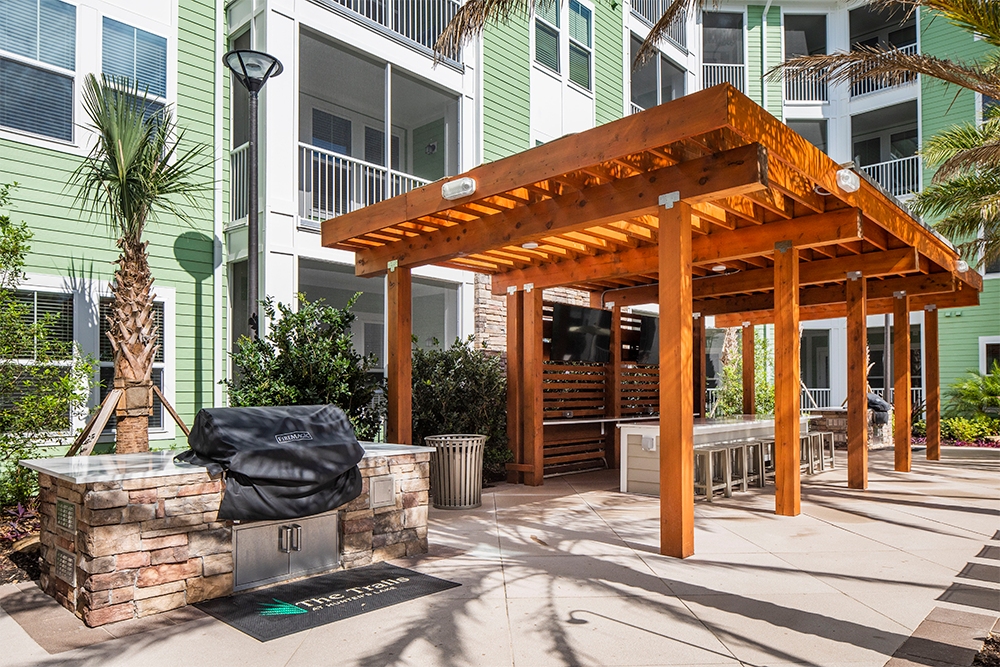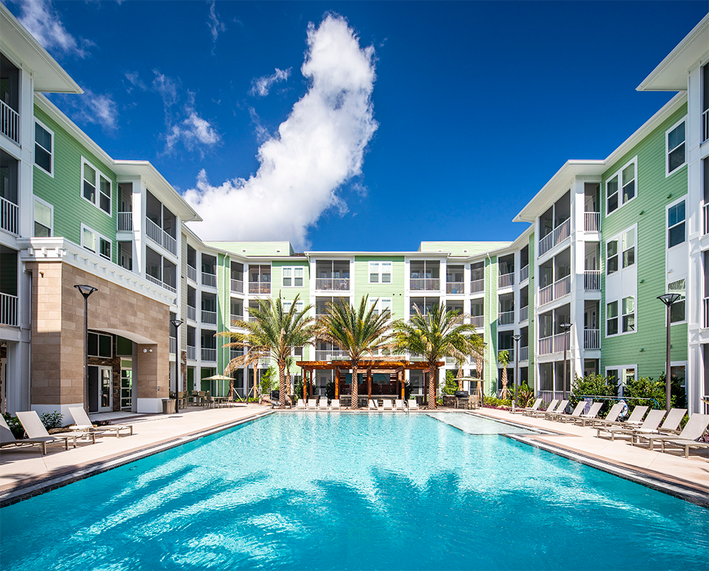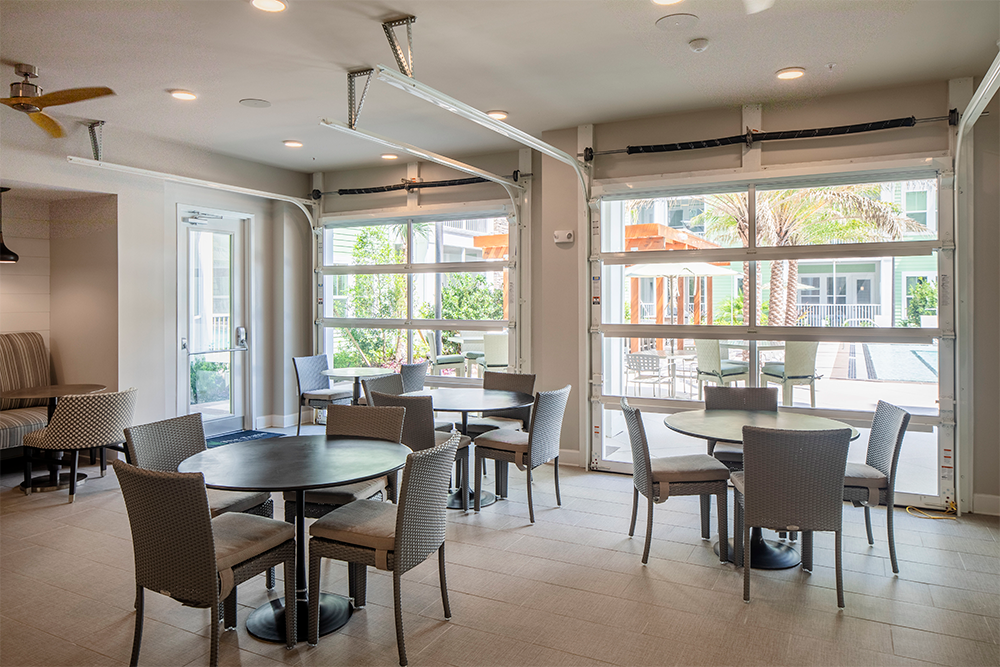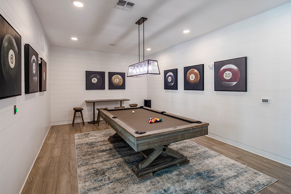 The on-property community amenities span over 8,000 square feet and include an exercise facility, gastropub, game room, and outdoor pool.
