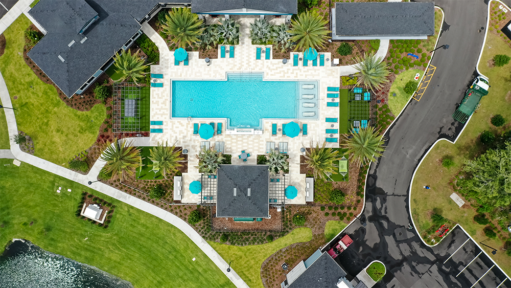 Residence interiors feature screened-in balconies, vinyl plank flooring, and granite countertops.