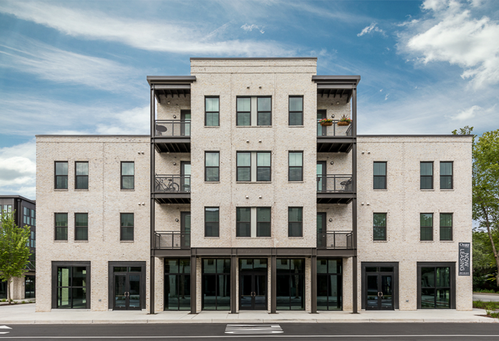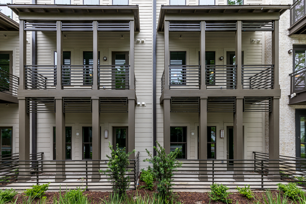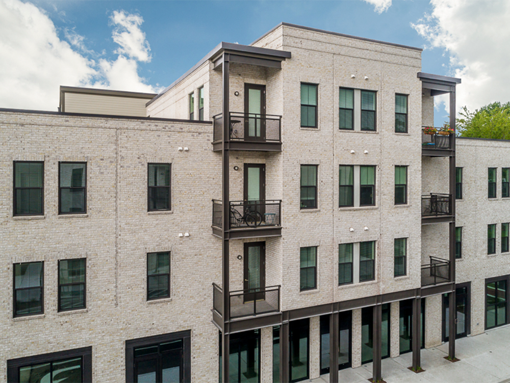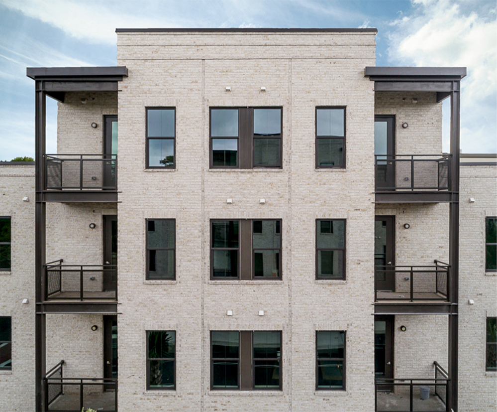 The architectural style is upscale and modern with clean lines and a flat roof. The exterior materials are a mix of brick, siding and metal that yield a very urban look.