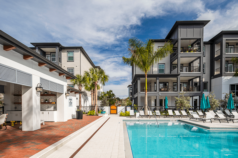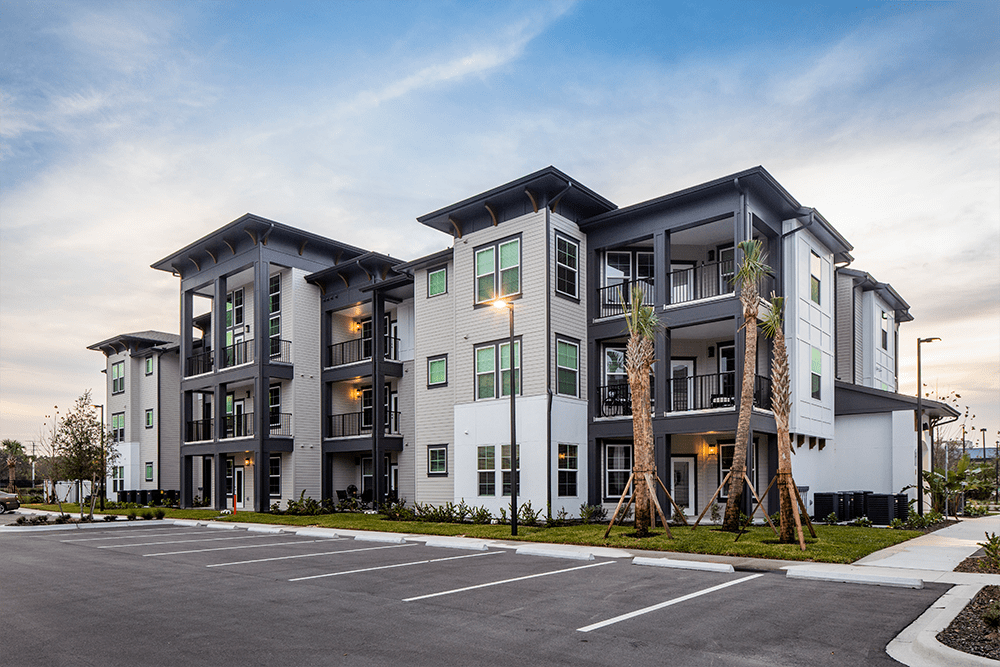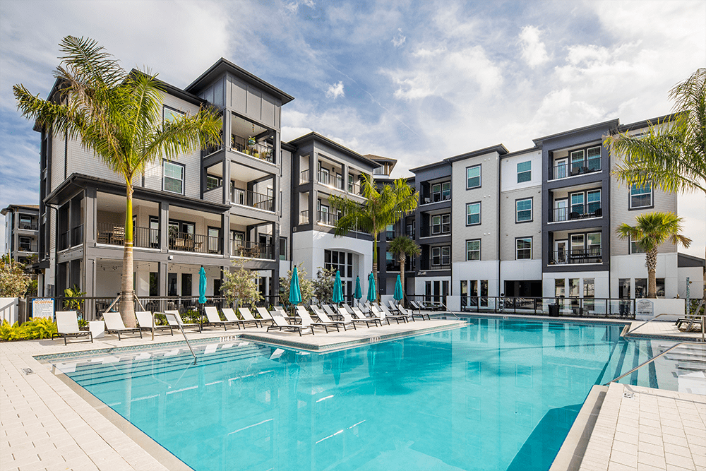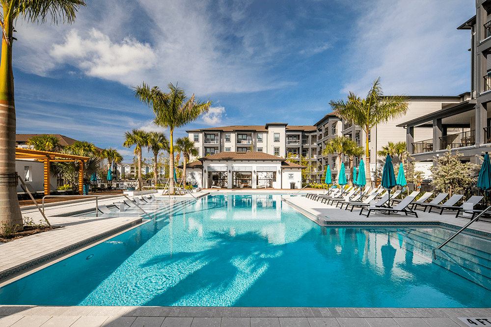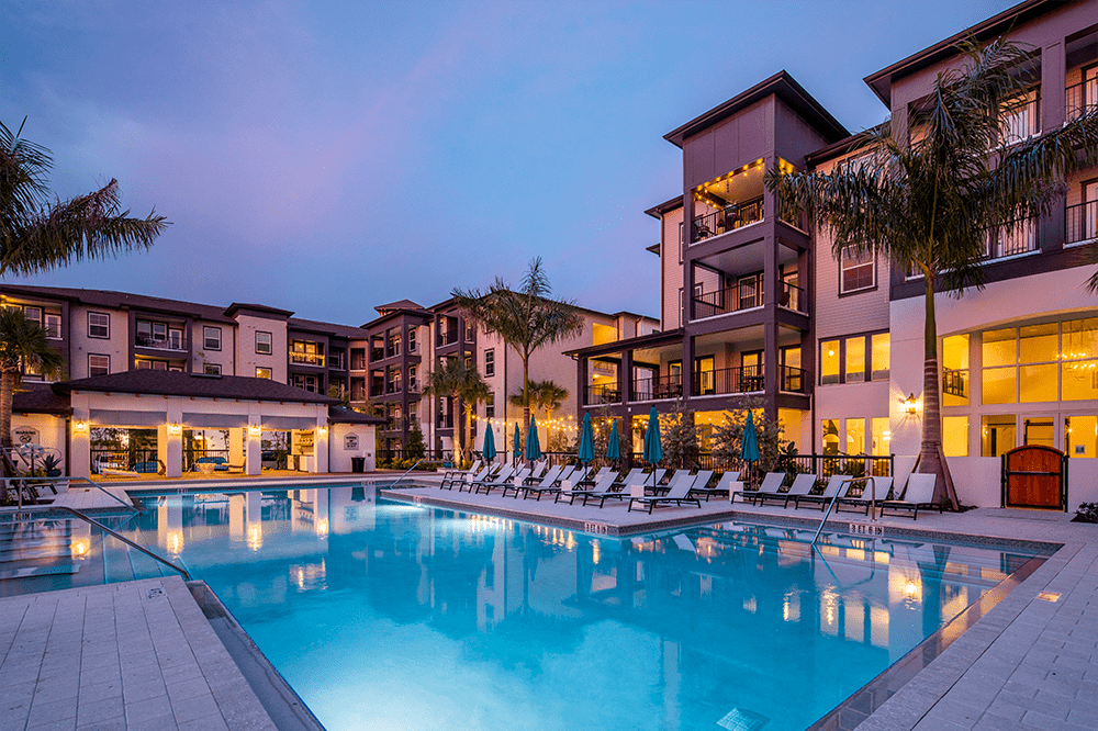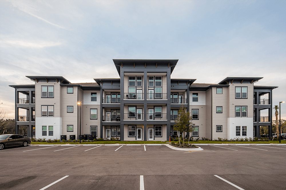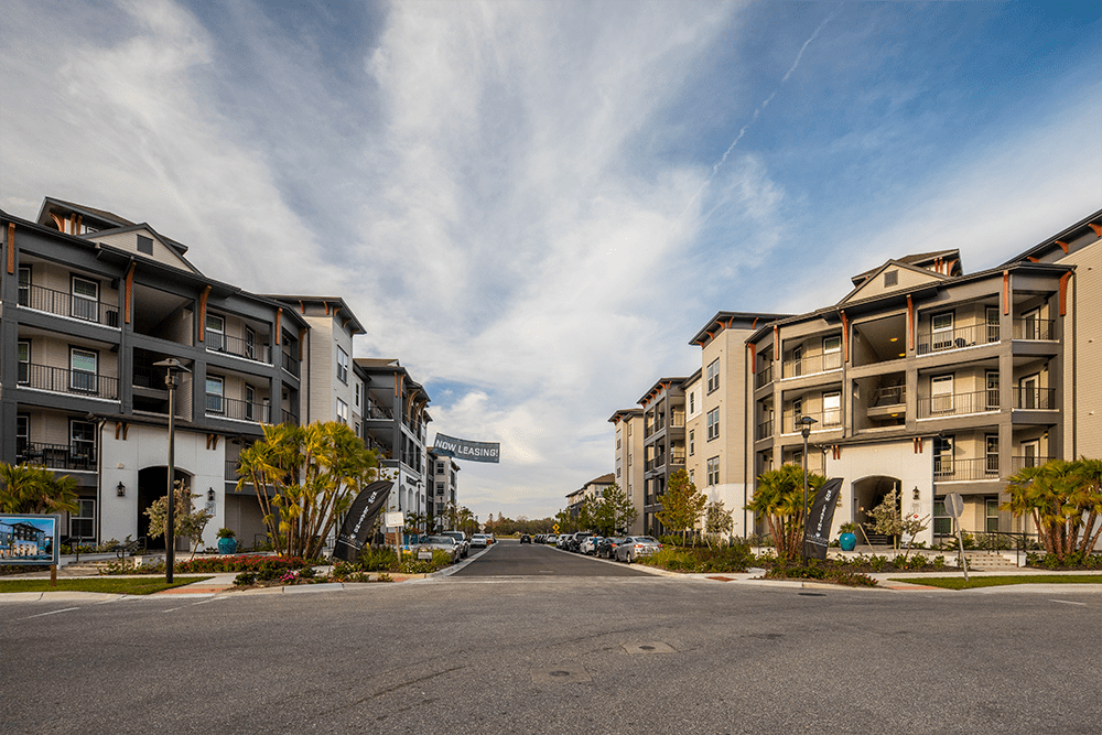Apartment buildings have elevators and stucco and siding exteriors with accentuated columns. The 353,505 square foot project’s access-controlled amenities include a clubhouse, pool with pavilion, dog park, and wash.