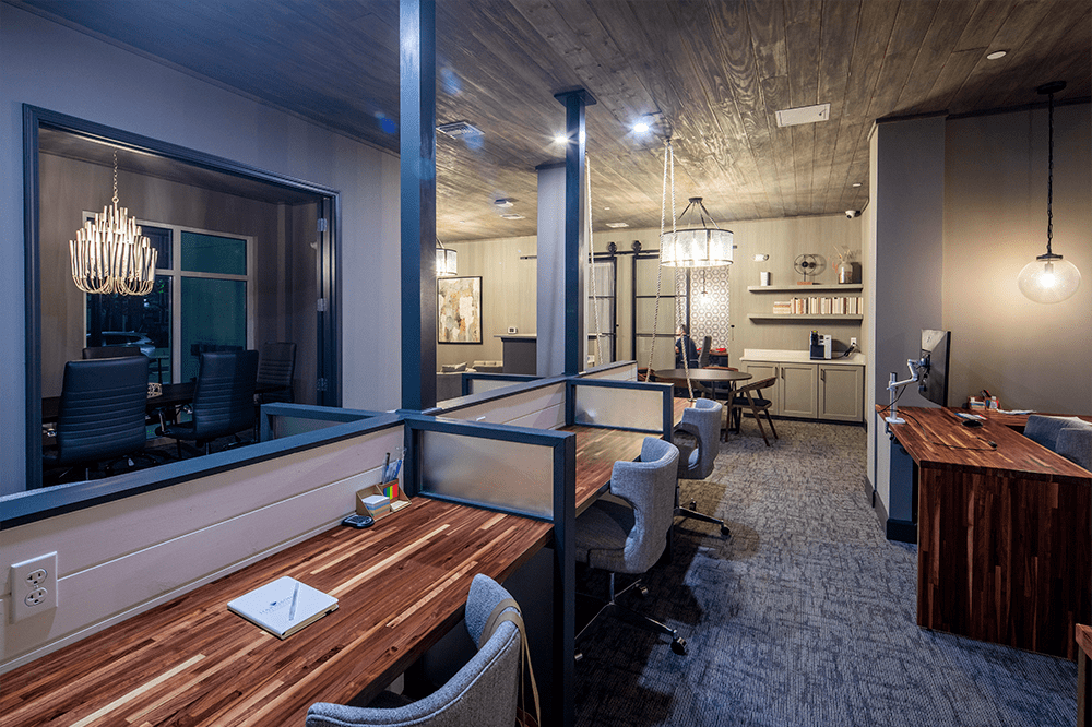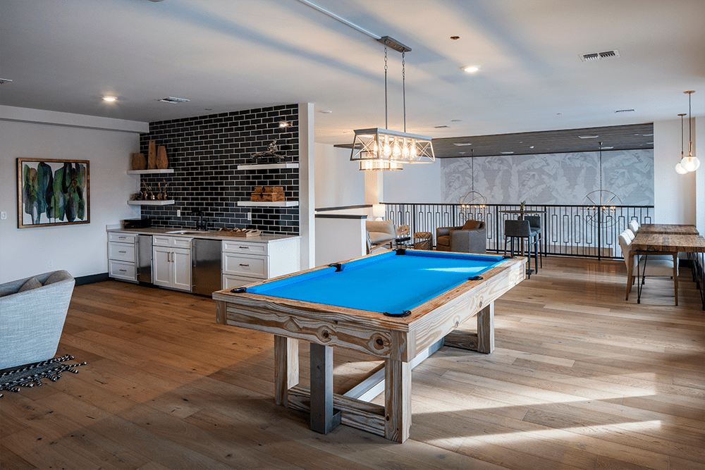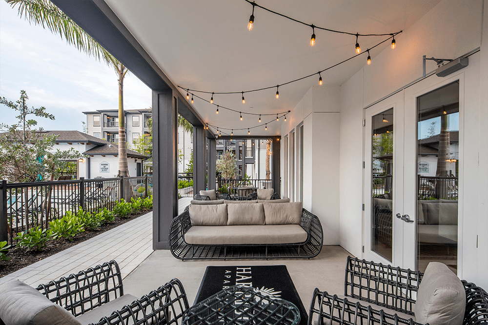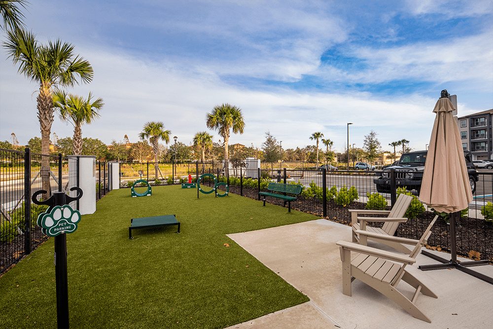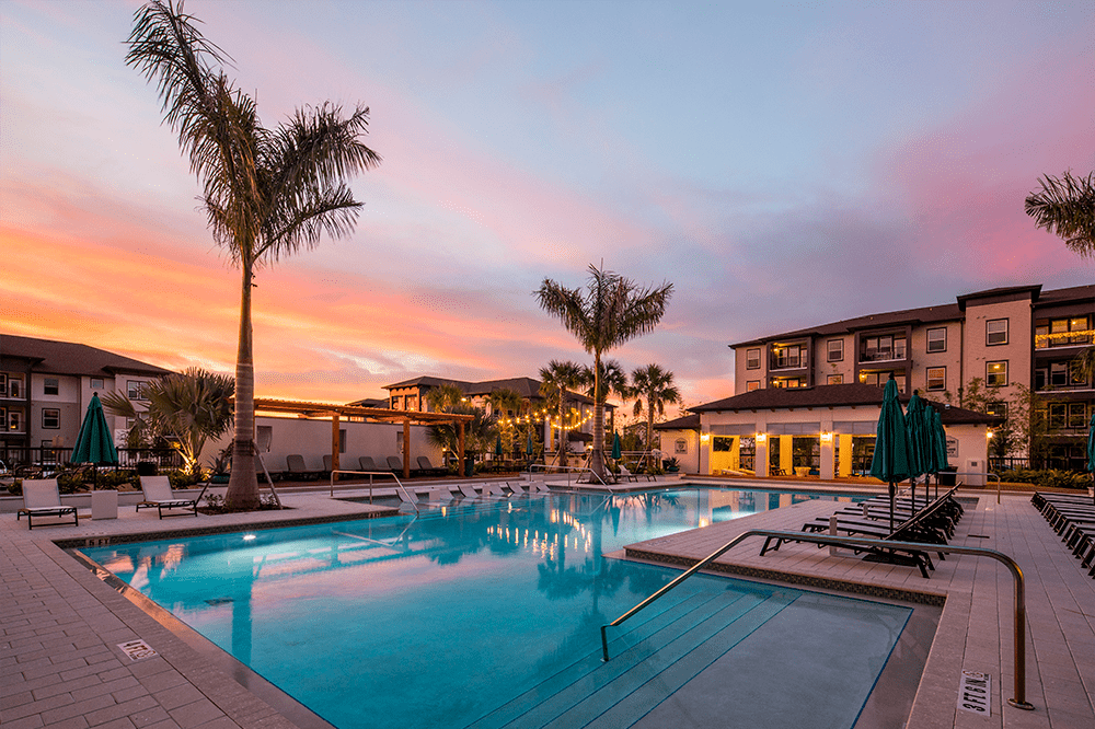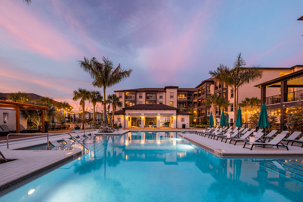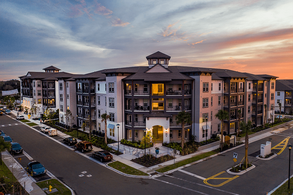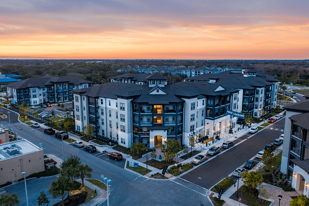Apartment buildings have elevators and stucco and siding exteriors with accentuated columns. The 353,505 square foot project’s access-controlled amenities include a clubhouse, pool with pavilion, dog park, and wash.