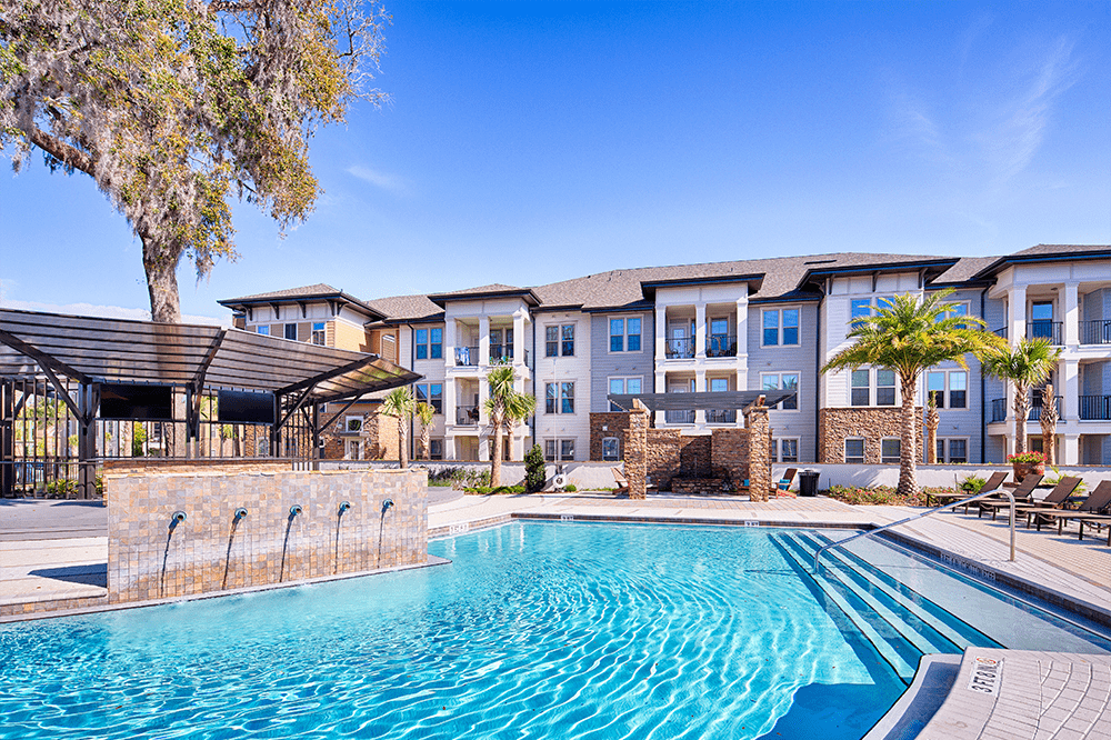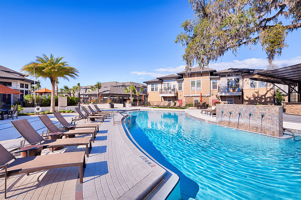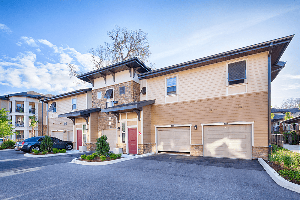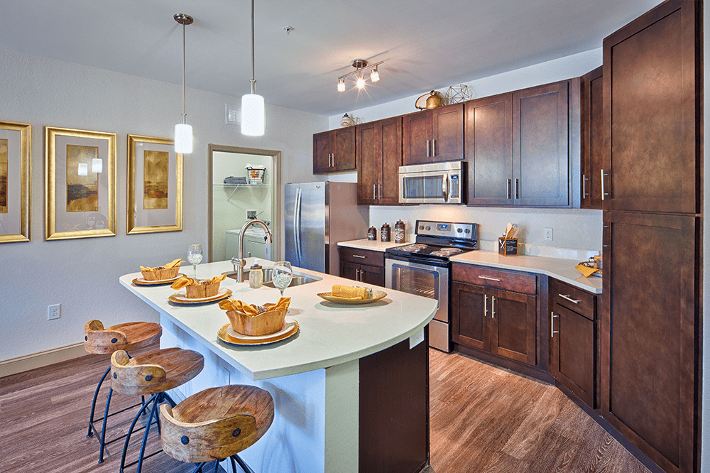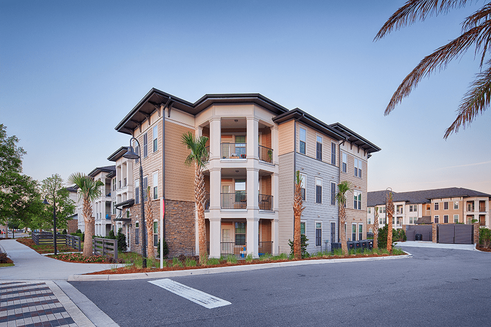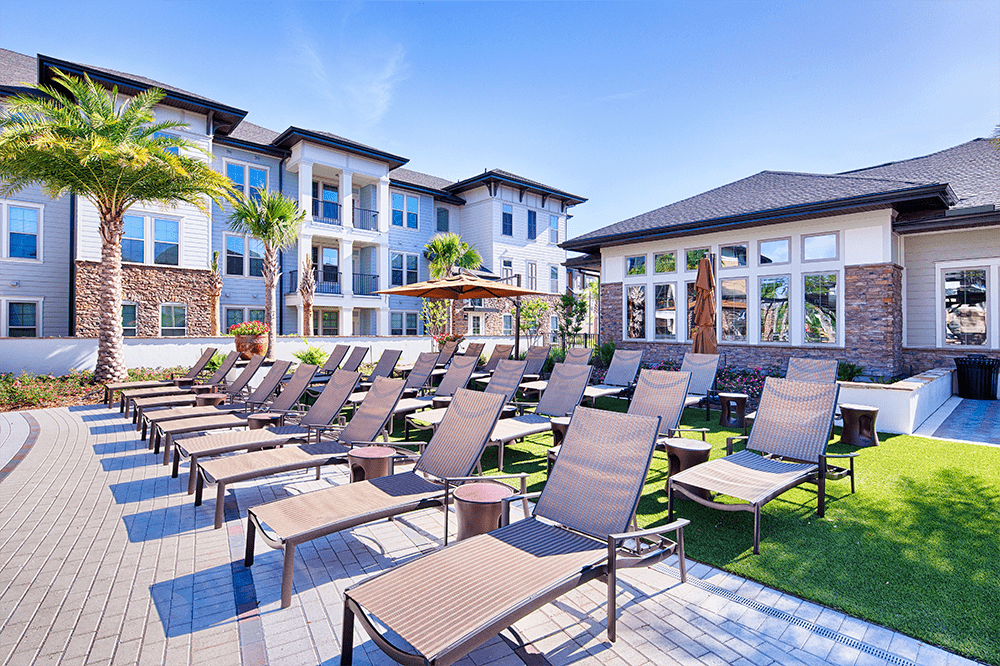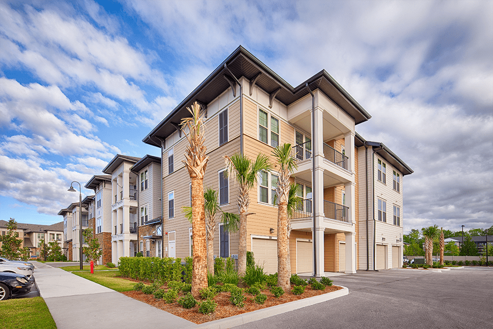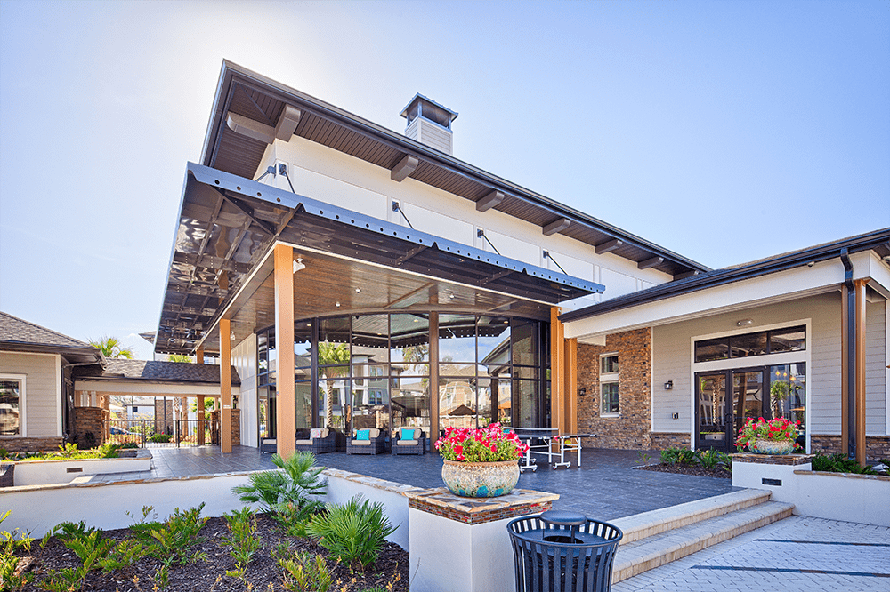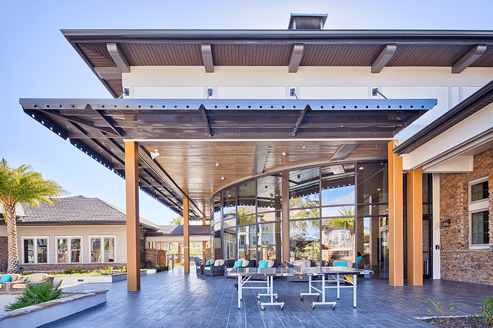 The Loree Apartments is made up of multiple, three-story buildings with an extensive use of stone and custom trellis work.