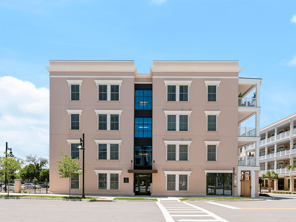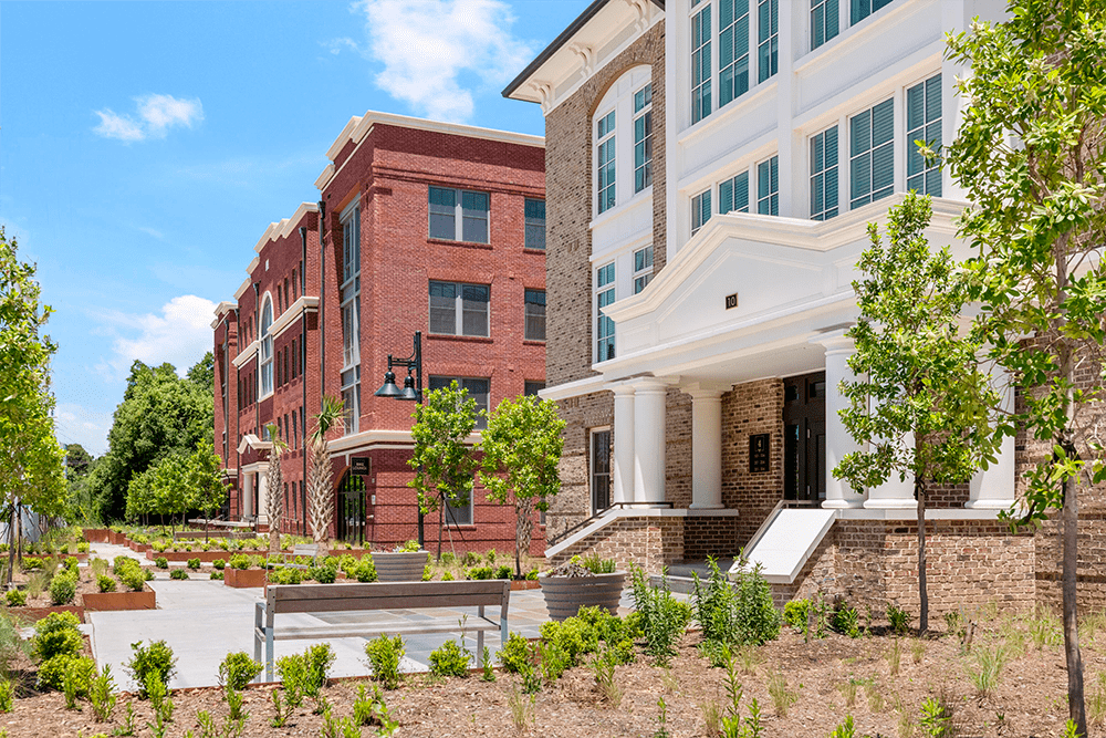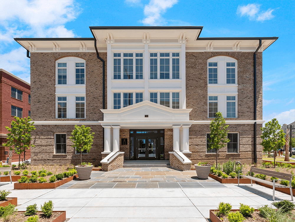The community’s Classic Revival architecture is reflected in stand-alone apartment buildings with stucco and brick exteriors, cast stone columns, corbels, and detailed cornices. The design signifies formal symmetrical design, decorative door surrounds, columns and sidelights.